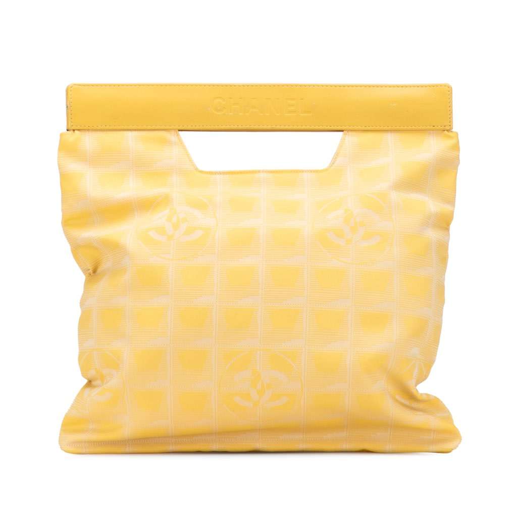 This handbag features a nylon body, flat leather handles, an open top with clasp closure, and an interior zip pocket.