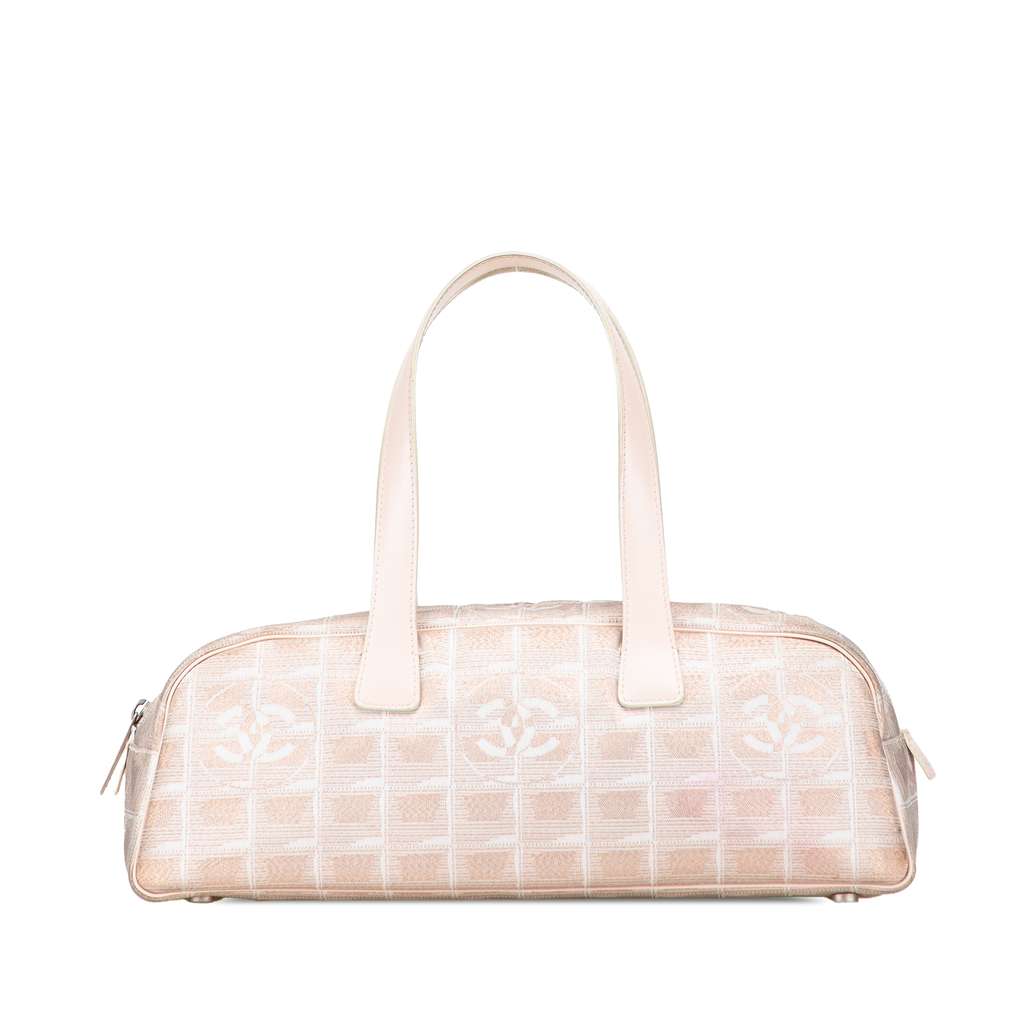 This handbag features a nylon body, flat leather handles, a top zip closure, and an interior zip pocket.