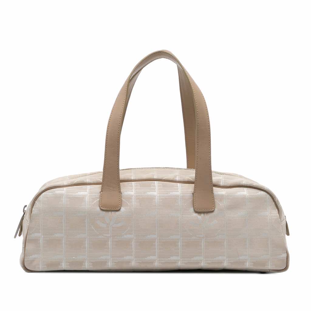 This handbag features a nylon body, flat leather handles, a top zip closure, and an interior zip pocket.