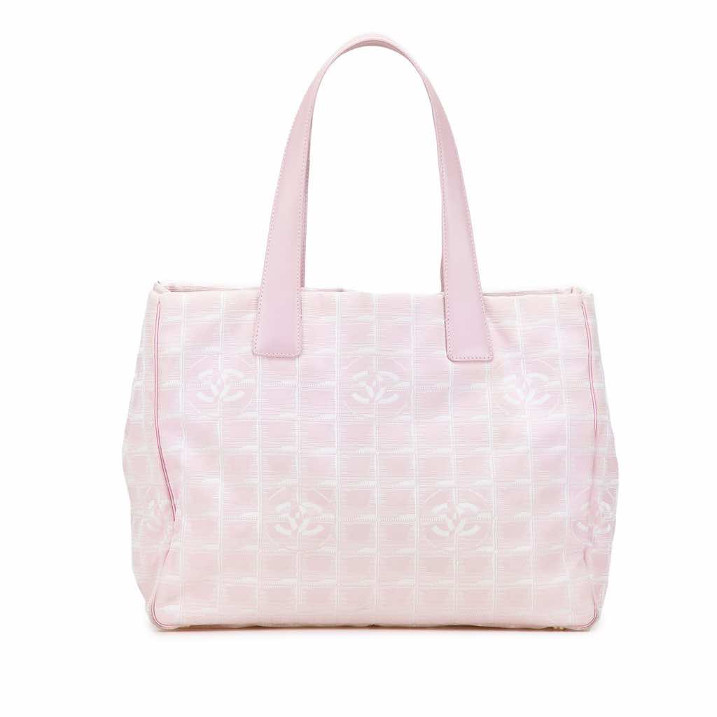 The New Travel Line tote bag features a nylon body with leather trim, flat leather straps, a top zip closure, and interior zip pockets.