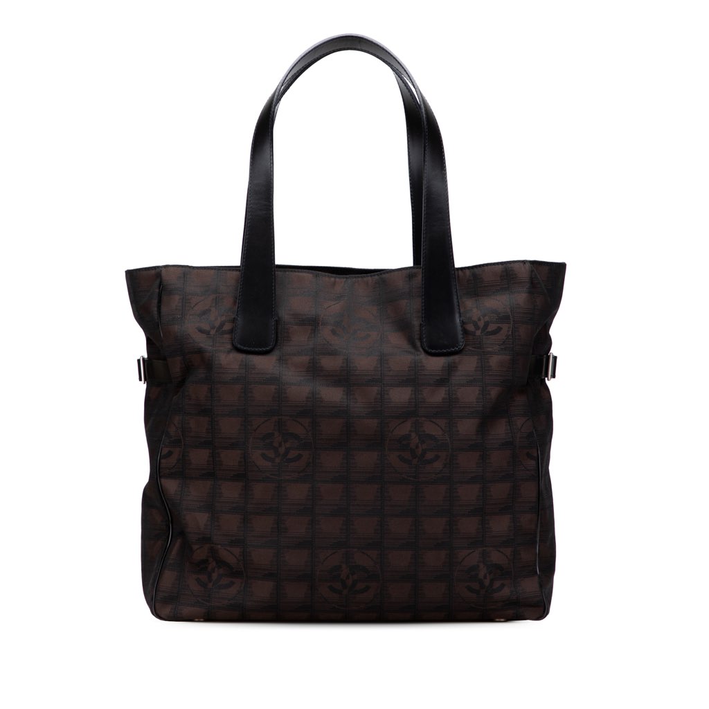 This tote bag features a nylon body, flat leather straps, an open top, and an interior zip pocket.