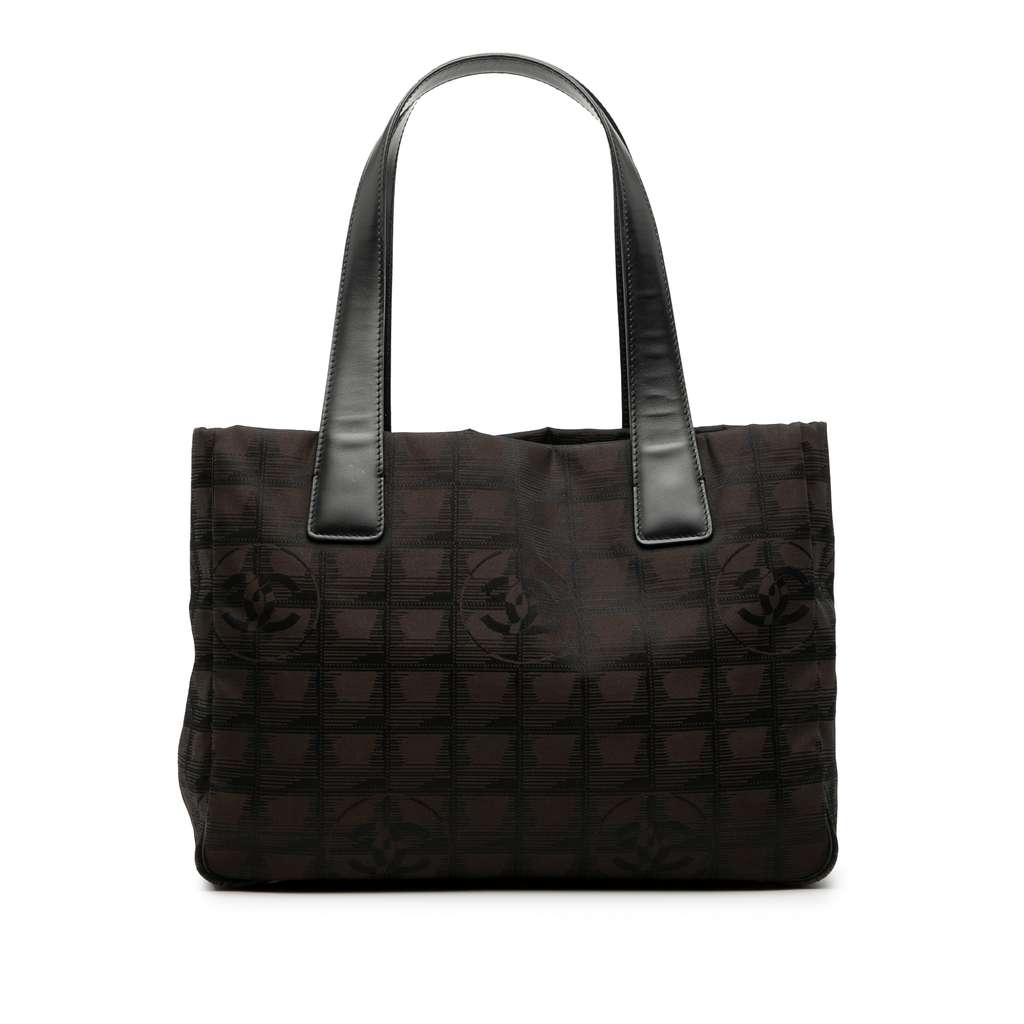 This tote bag features a nylon body, flat leather straps, an open top, and interior zip pockets.