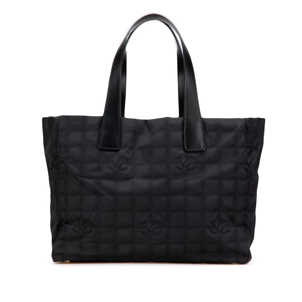 This tote bag features a nylon body with leather trim, flat leather straps, an open top, and interior zip pockets.