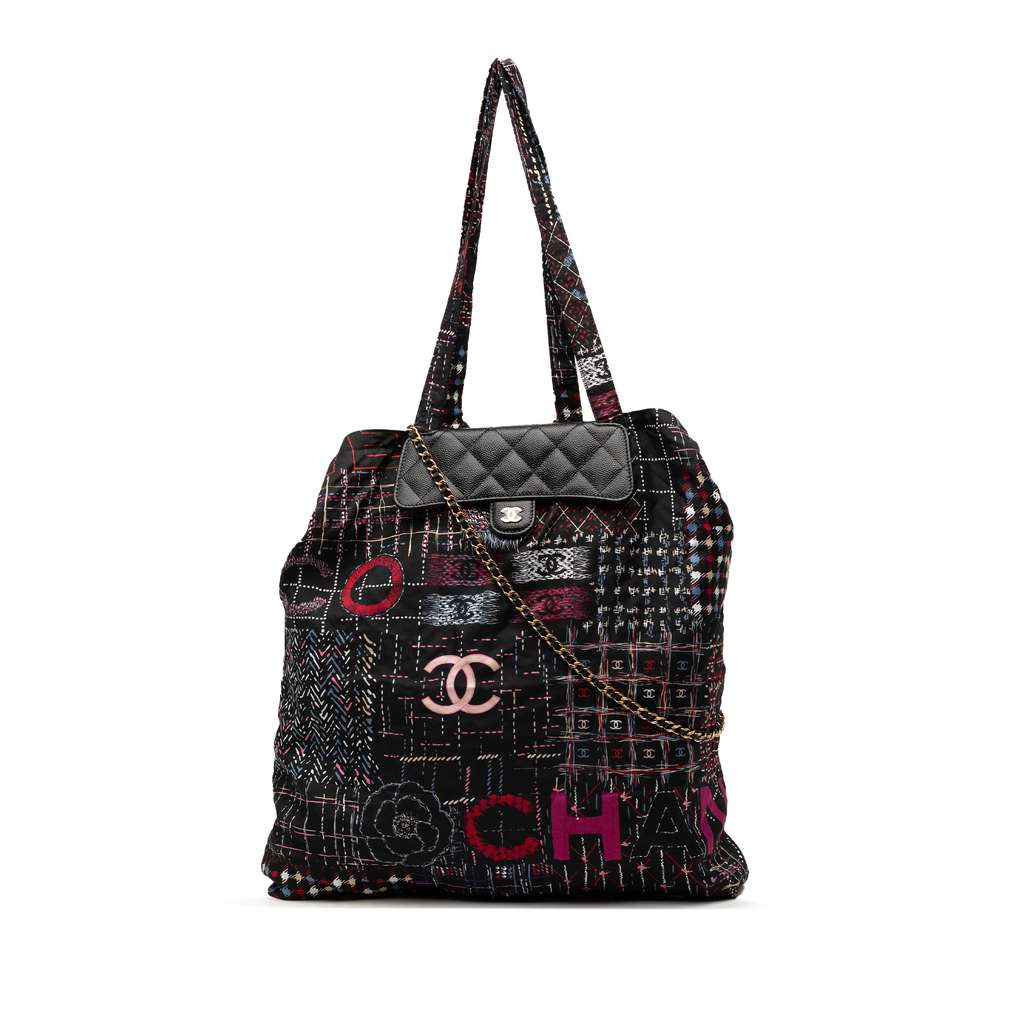 This tote bag features a foldable nylon tote in a caviar leather flap, a leather woven chain strap, and a front flap with magnetic snap closure.