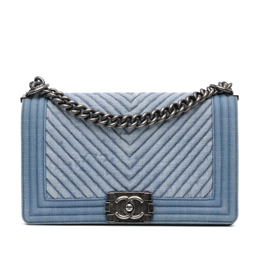 The Boy flap features a quilted denim body, a curb chain strap with an adjustable flat leather guard, a front flap with push-lock closure, and an interior slip pocket.