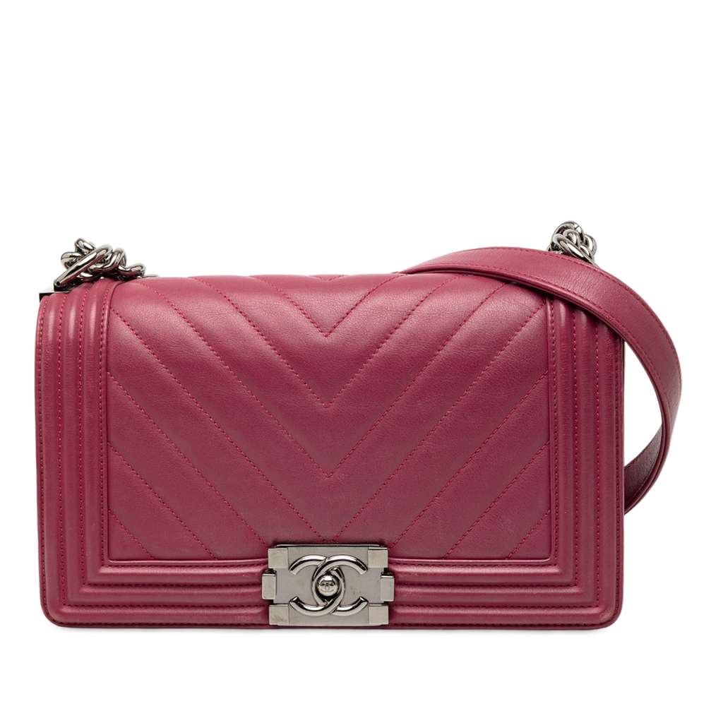 The Boy Flap bag features a quilted lambskin leather body, a curb chain shoulder strap with leather guard, a front flap with interlocking Cs and push-lock closure, and interior slip pockets.