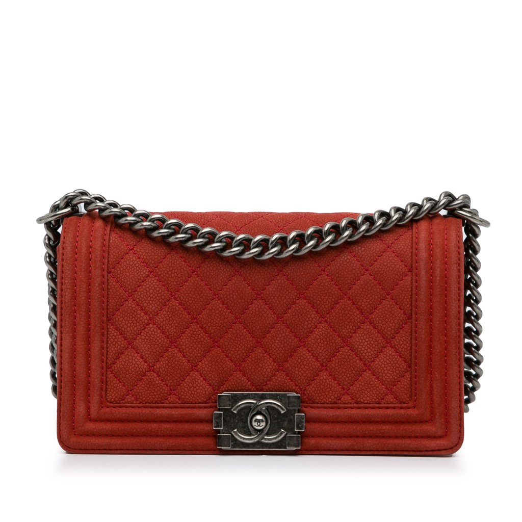 This crossbody bag features a quilted caviar leather body, a curb chain strap with leather guard, a front flap with a CC push-lock closure, and interior zip and slip pockets.