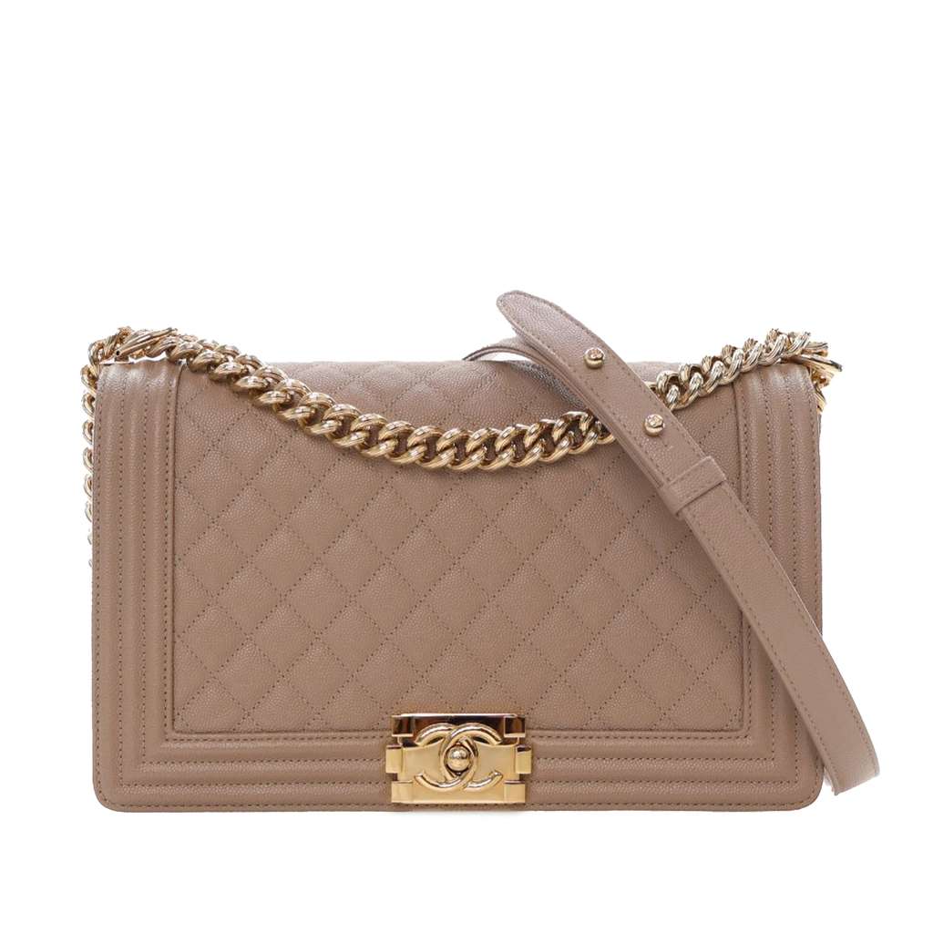 This crossbody bag features a quilted caviar leather body, a curb chain strap with leather guard, a front flap with a CC push-lock closure, and an interior zip pocket.