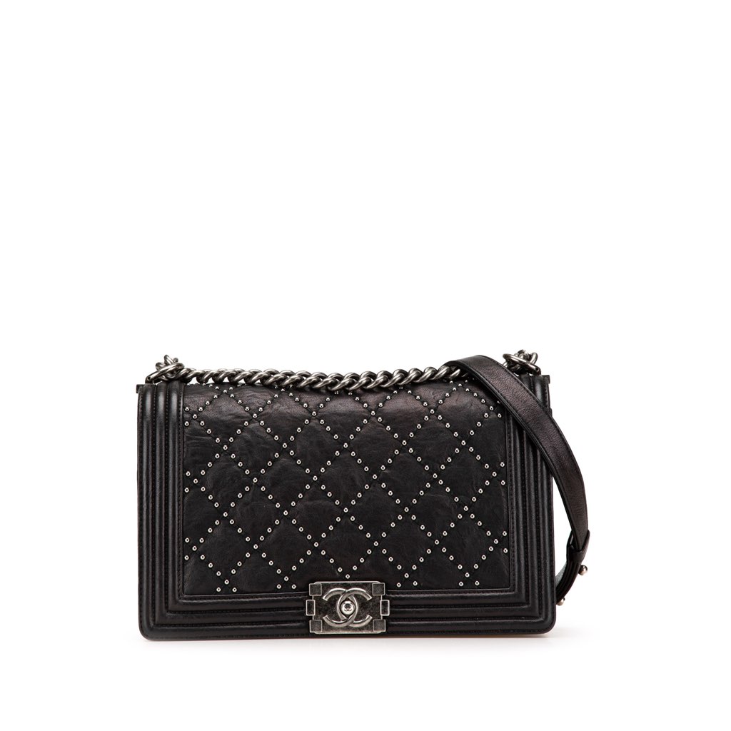 The Boy bag features a studded calfskin leather body, a front flap with a CC push-lock closure, a chain shoulder strap, and an interior slip pocket.