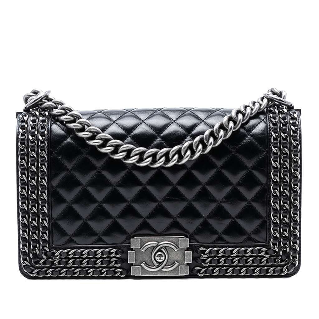 The Boy flap bag features a quilted calf leather body with chain embellishments, a chain link strap with leather shoulder guard, a front flap with a push lock closure, and an interior slip pocket.