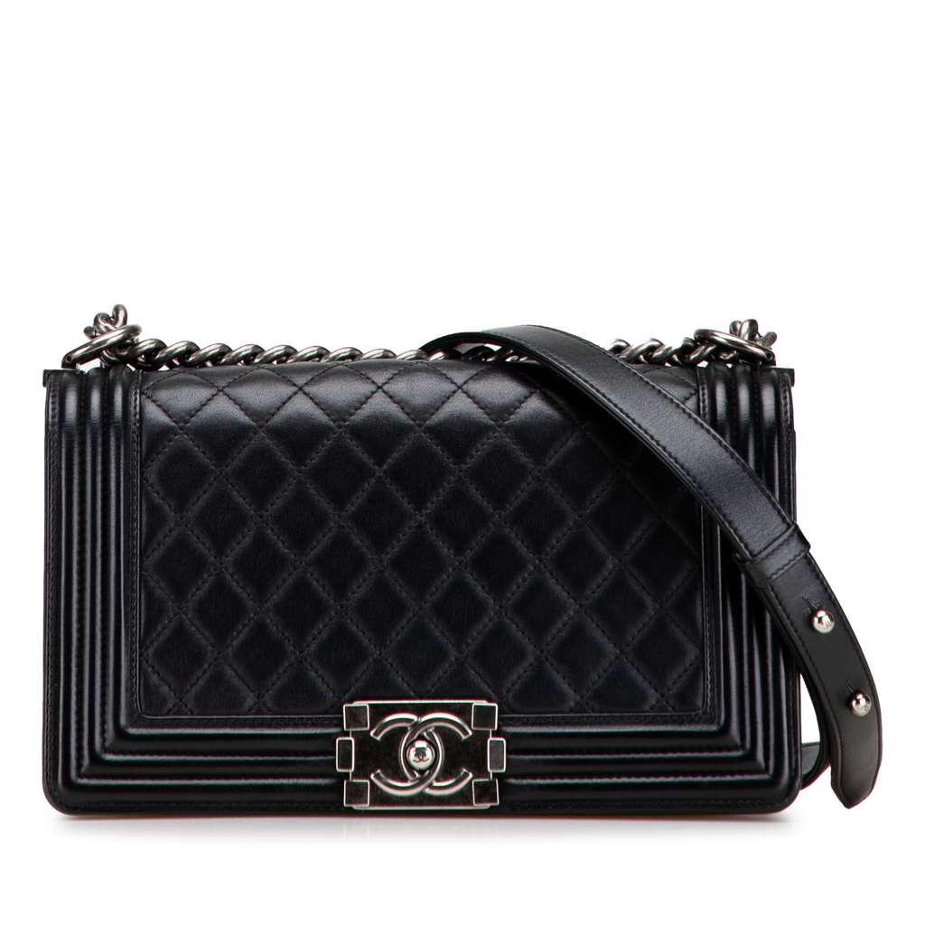 The Boy flap features a quilted lambskin leather body, a chain link and an adjustable leather shoulder strap, a front flap with a push lock closure, and an interior zip pocket.