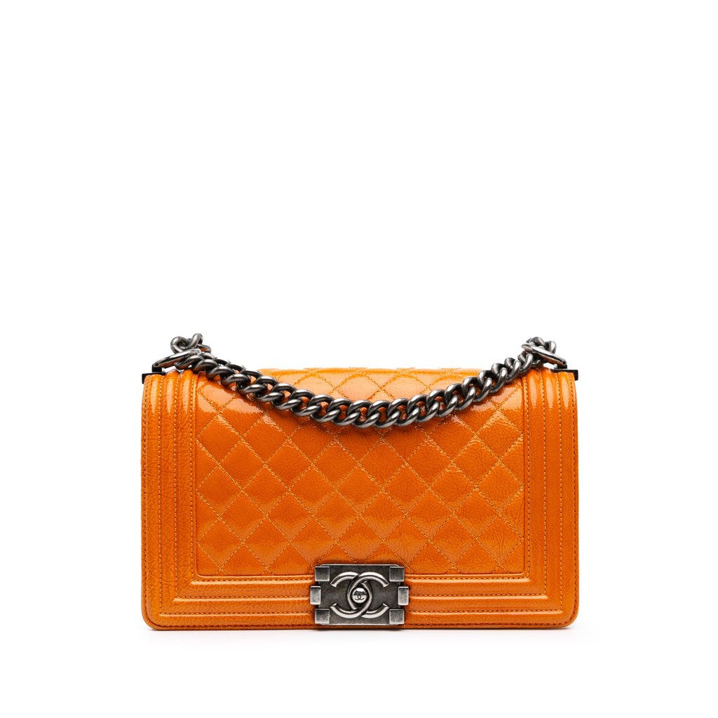 The Boy bag features a patent leather body, a metal chain and leather shoulder strap, a front flap with push lock closure, and an interior slip pocket. Handle and lining are repainted.