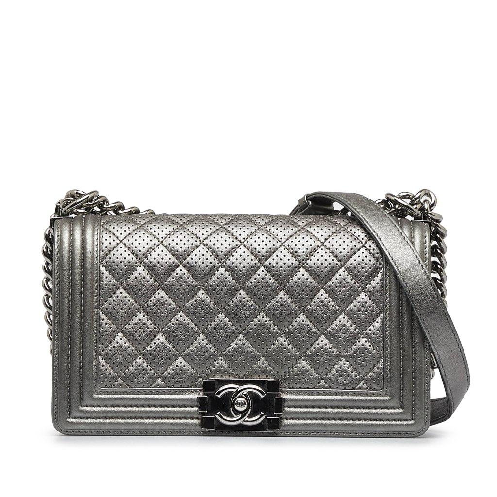 This shoulder bag features a perforated lambskin leather body, curb chain shoulder strap, a front flap with a push lock closure, and an interior slip pocket.