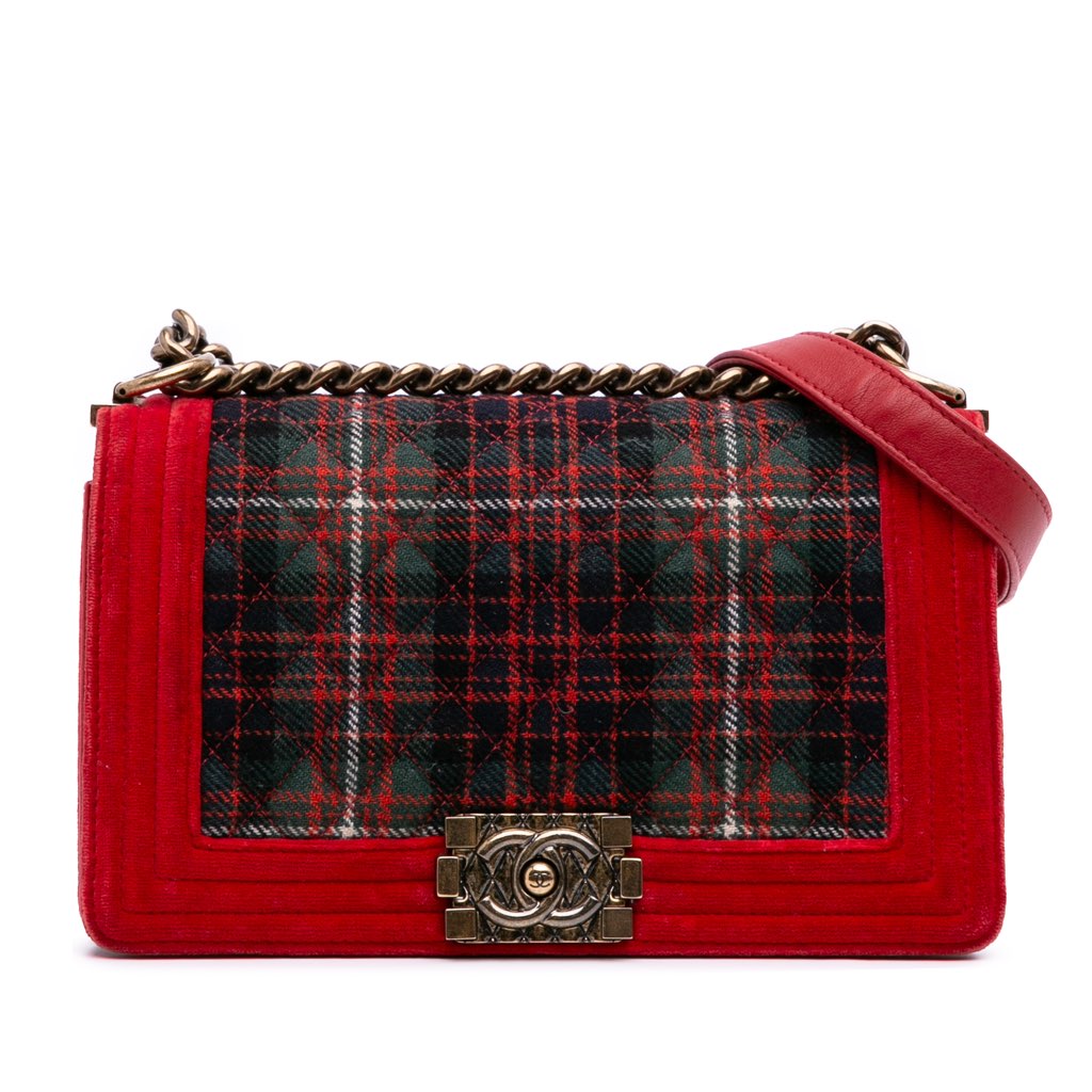 The Velvet Tweed Boy Bag features a velvet and tweed body, a chain-link strap with leather guard, a flap with push-lock closure, and an interior slip compartment