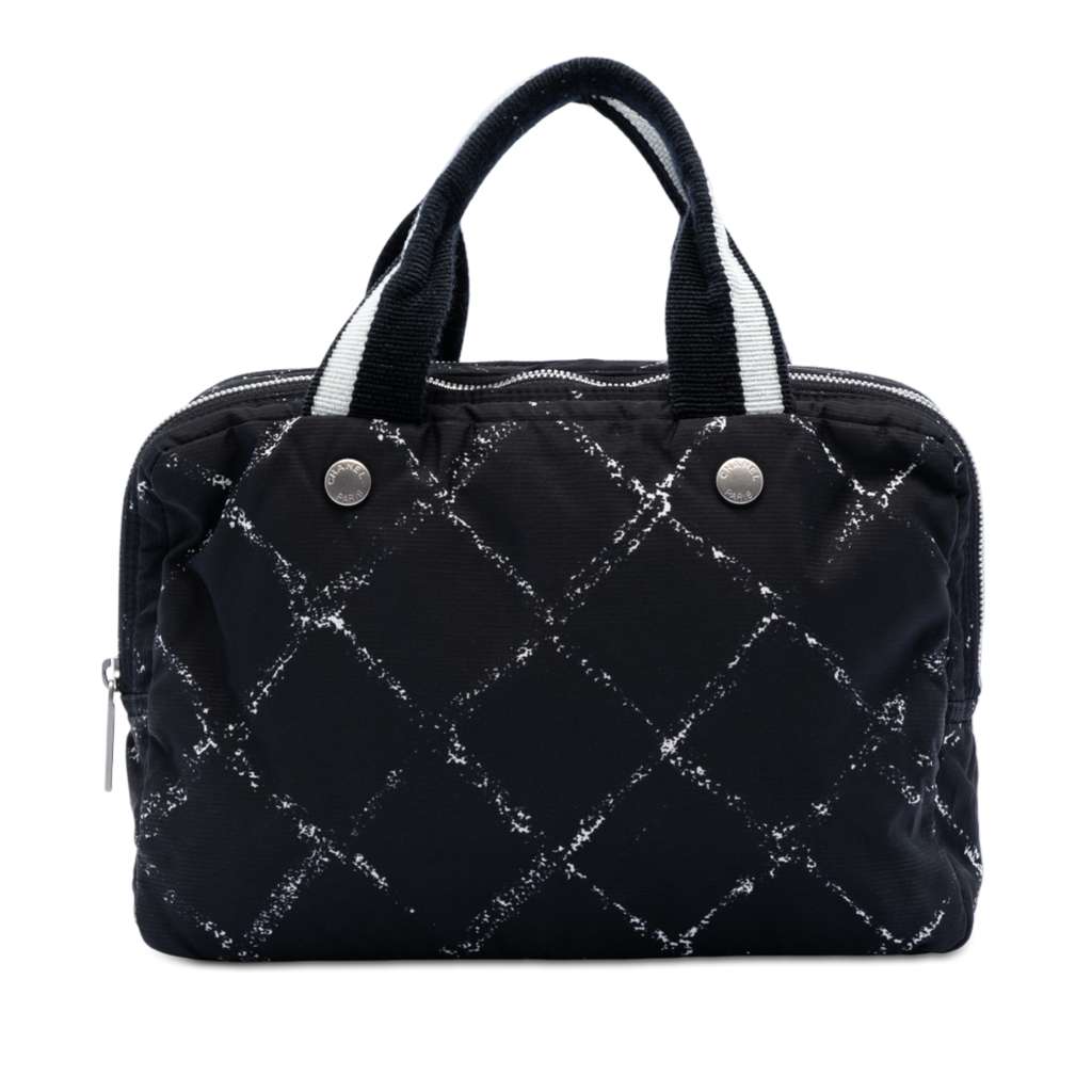 This handbag features a nylon body, flat straps, and top zip closures.