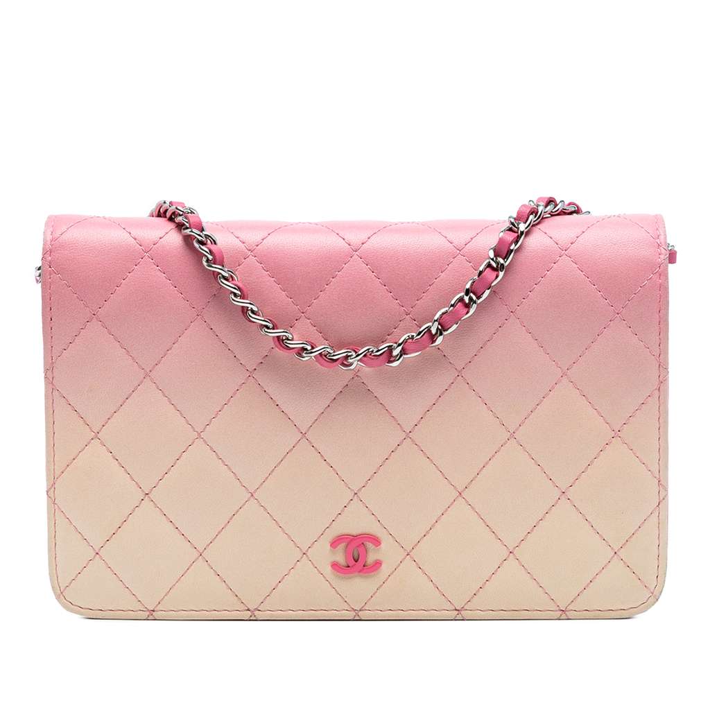 This wallet on chain features a quilted lambskin leather body, a leather woven chain strap, a front flap with snap closure, and interior zip and slip pockets.