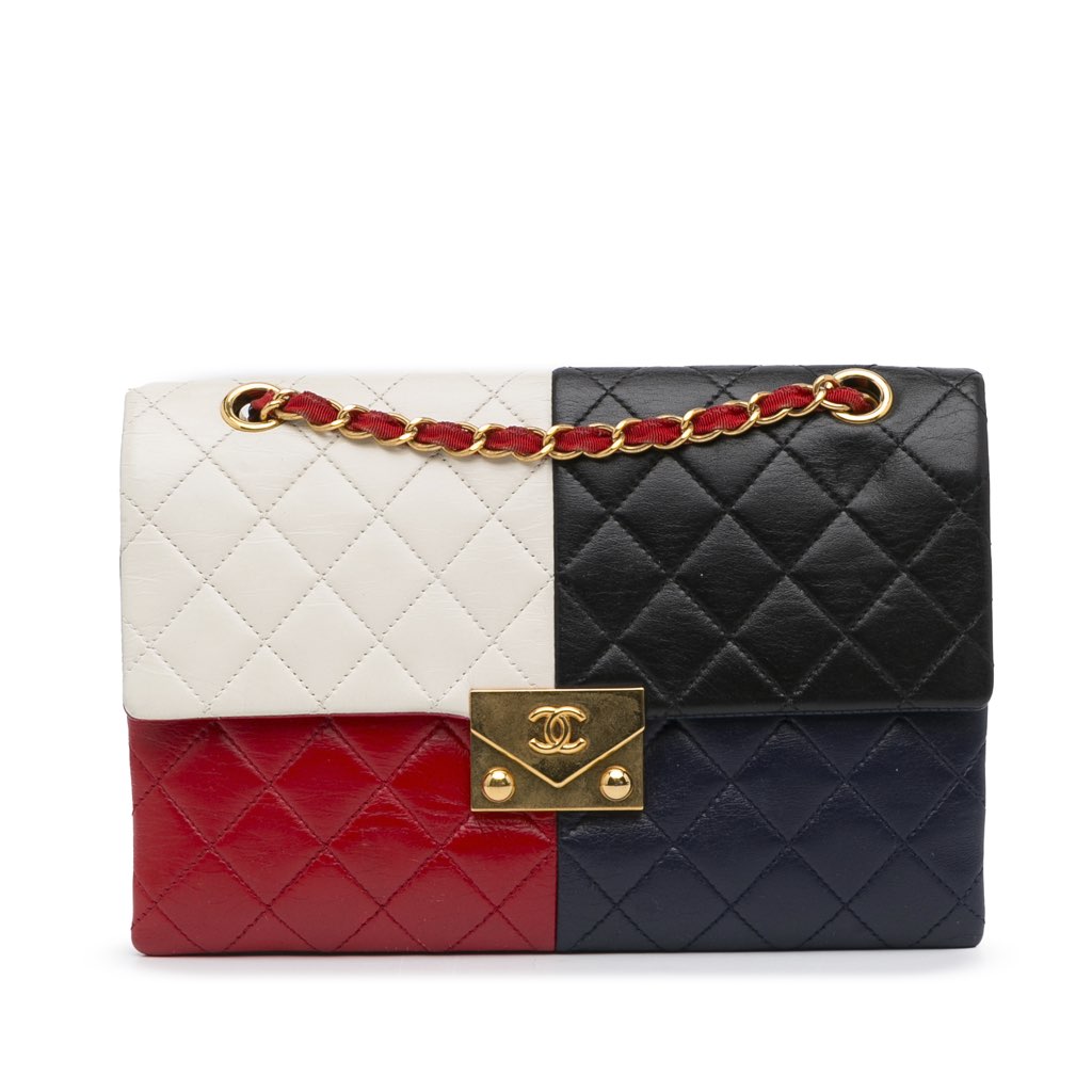 This shoulder bag features a lambskin leather body, a woven nylon chain shoulder strap, front flap with metal lock closure, and interior zip and slip compartments. Bag is repainted.