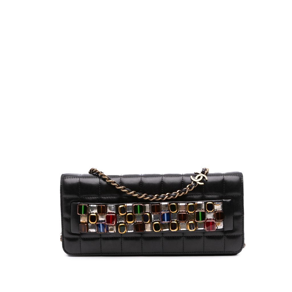 This crossbody bag features a lambskin leather body with jewel embellishments, a leather-woven chain strap, a front flap with magnetic snap closure, and an interior slip pocket.