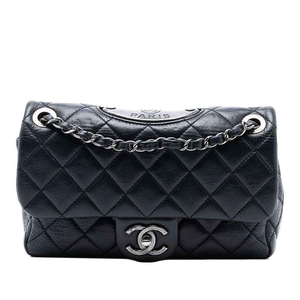 This crossbody bag features a quilted calf leather body, a silver-tone leather woven chain link strap, a front flap with turn lock closure, and an interior zip pocket.