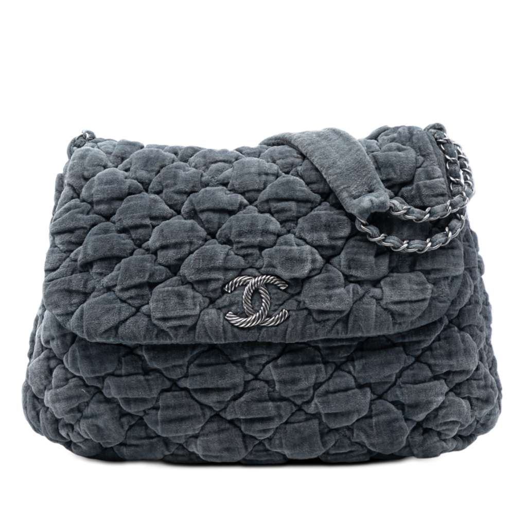This shoulder bag features a quilted velvet body, a velvet woven chain link strap, a front flap with magnetic snap closure, and interior zip and slip pockets.