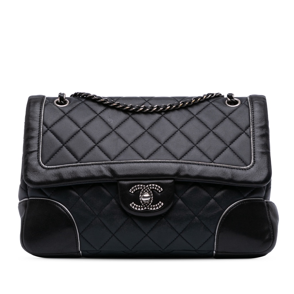 This shoulder bag features a quilted lambskin leather body, leather woven chain link strap, a front flap with twist lock closure, and interior zip and slip pockets.