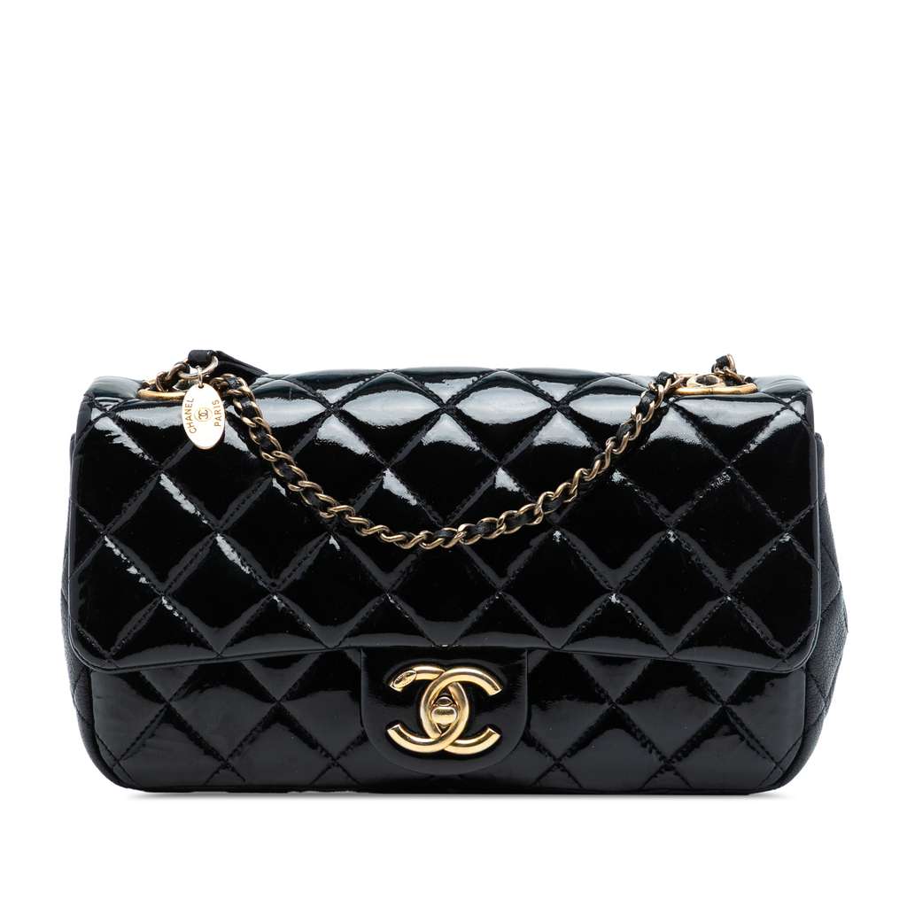 This flap bag features a quilted patent leather body, a curb chain strap with leather guard, a front flap with interlocking Cs and twist lock closure, an exterior back slip pocket, and an interior zip pocket.