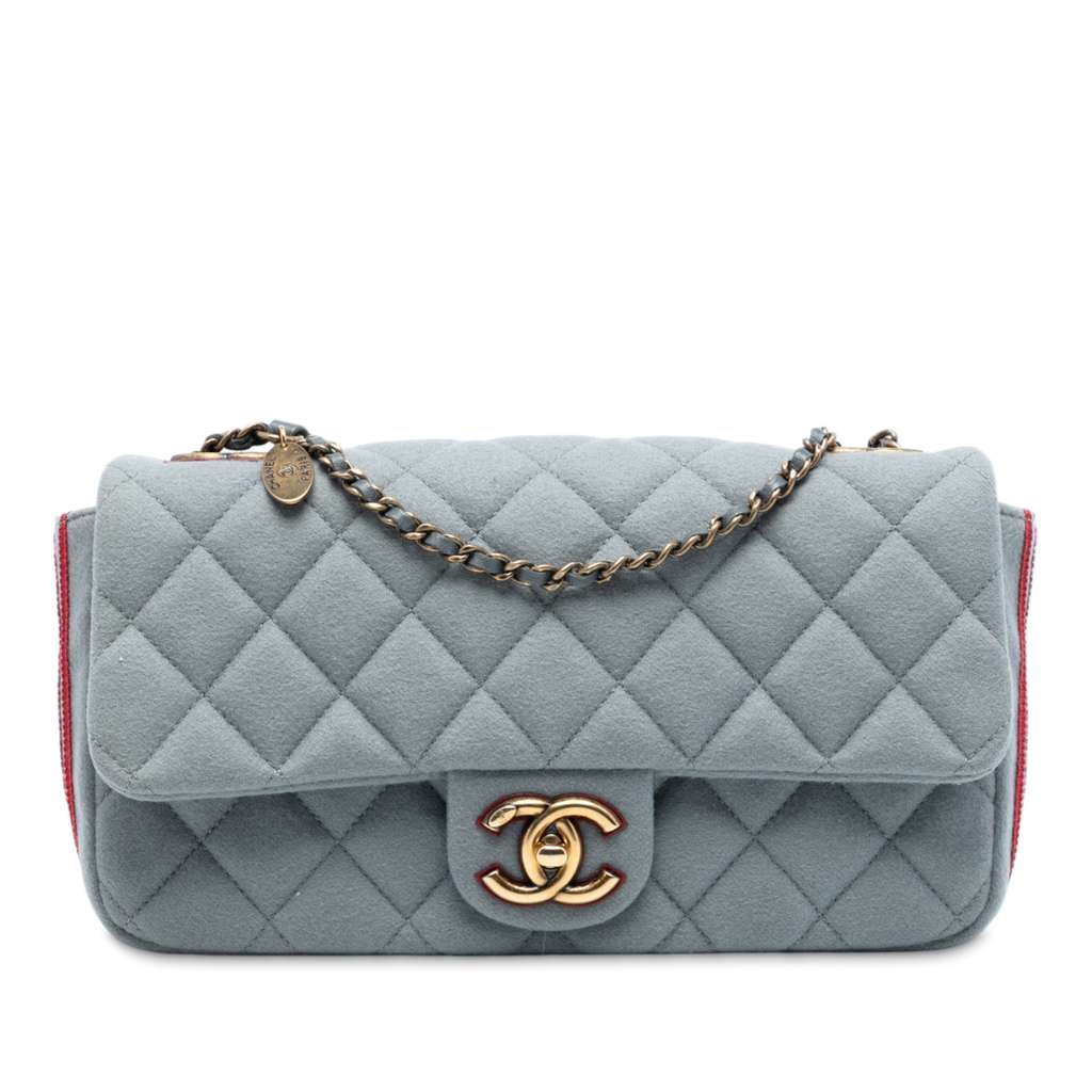This flap bag features a quilted felt body with canvas trim, a leather woven chain link strap with leather guard, a front flap with interlocking Cs and twist lock closure, an exterior back slip pocket, and an interior zip pocket.