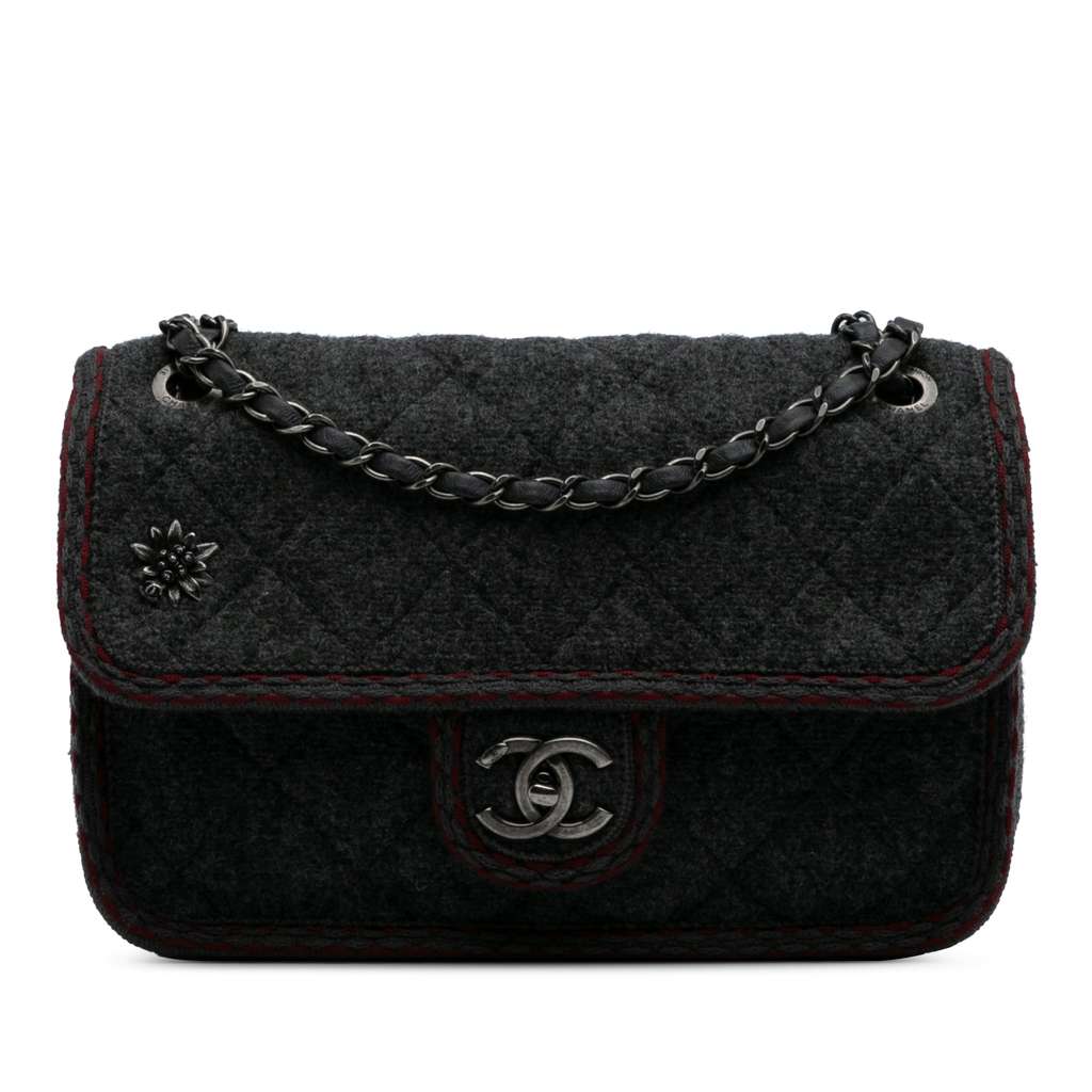 The Edelweiss flap bag features a quilted wool body, leather woven chain link straps, a front flap with twist lock closure, and an interior zip pocket.