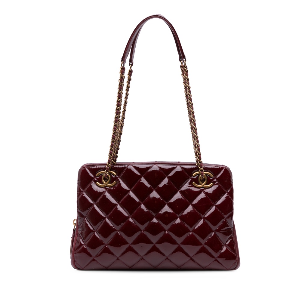 This tote features a quilted patent and goatskin leather body, leather woven chain shoulder straps with leather guards, an open top with two open compartments, an interior zip compartment, and an interior zip pocket.