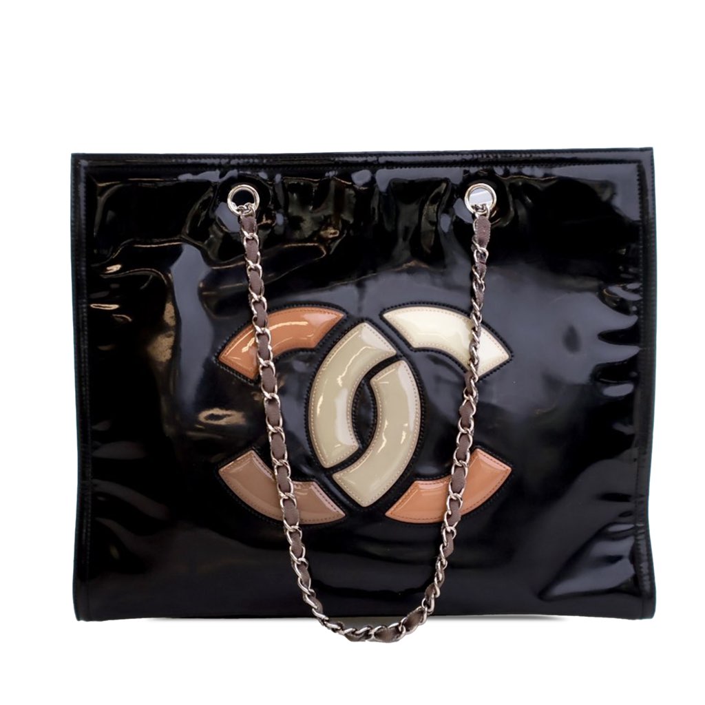 This tote bag features a patent leather body, fabric woven chain link straps, a top strap with snap button closure, and interior zip and slip pockets.