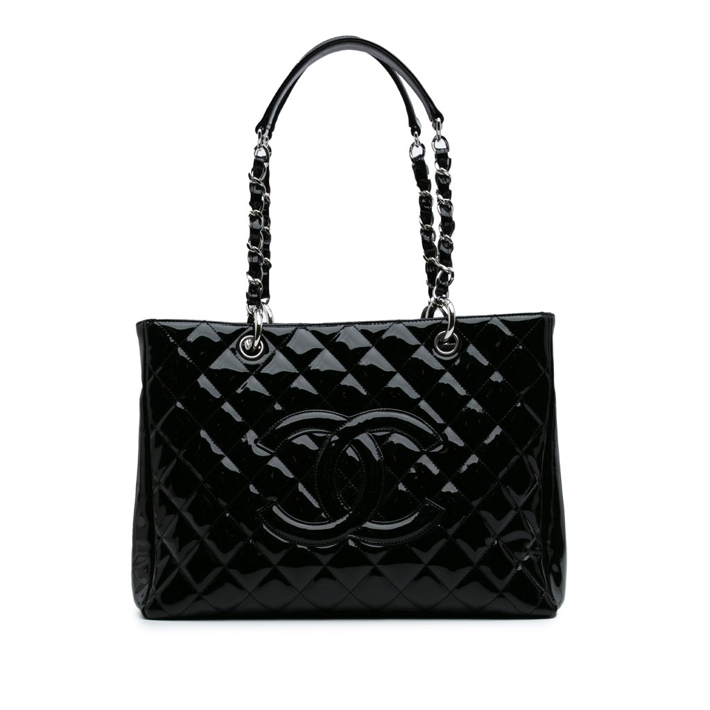 The Grand Shopping Tote features a quilted patent leather body, curb chain straps, an open top, a back exterior slip pocket, and interior zip and slip pockets.