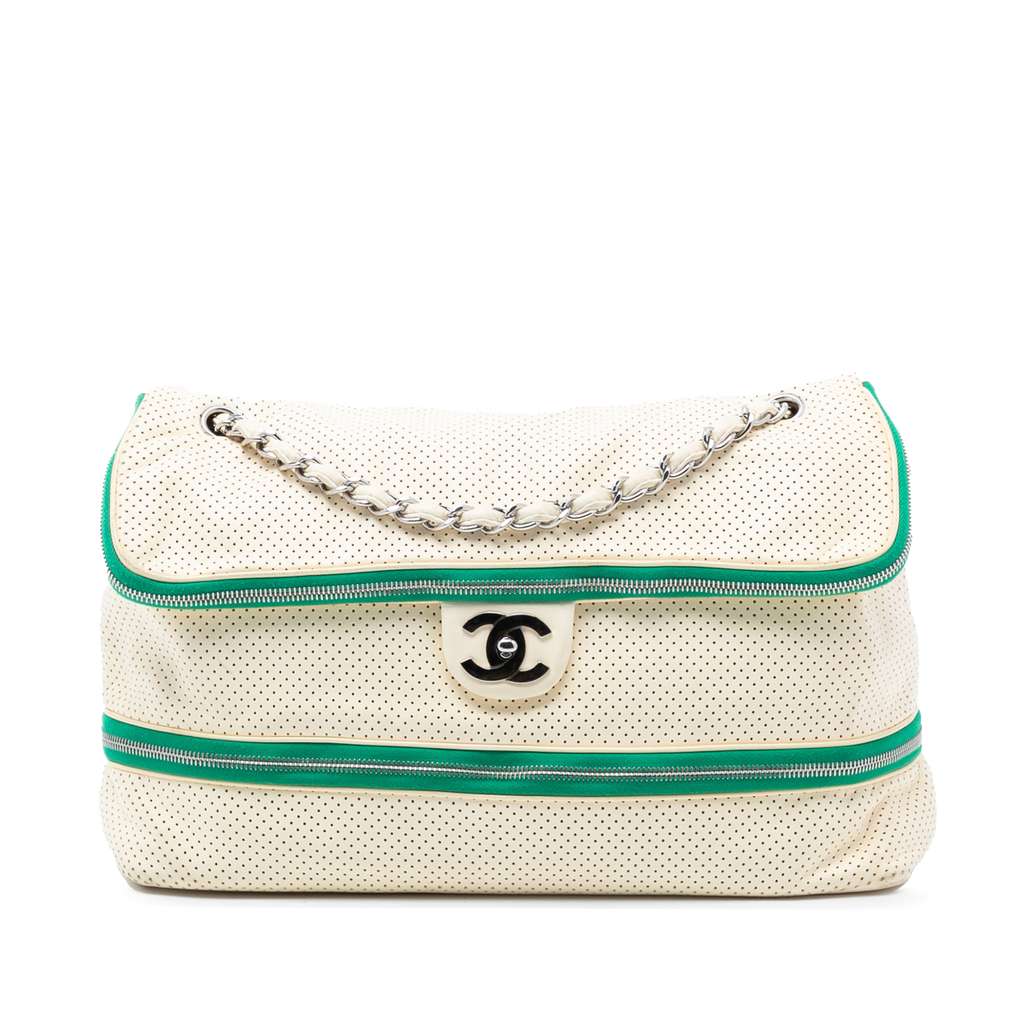 This shoulder bag features a perforated leather body, leather woven chain straps, a front flap with twist lock closure, exterior zip around pockets, and interior zip and slip pockets.