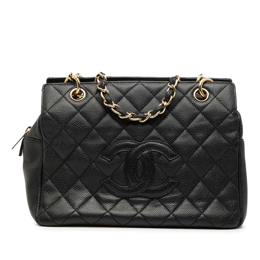The Petit Shopping Tote bag features a caviar leather body, leather woven chain straps, a top zip closure, and interior zip and slip pockets.