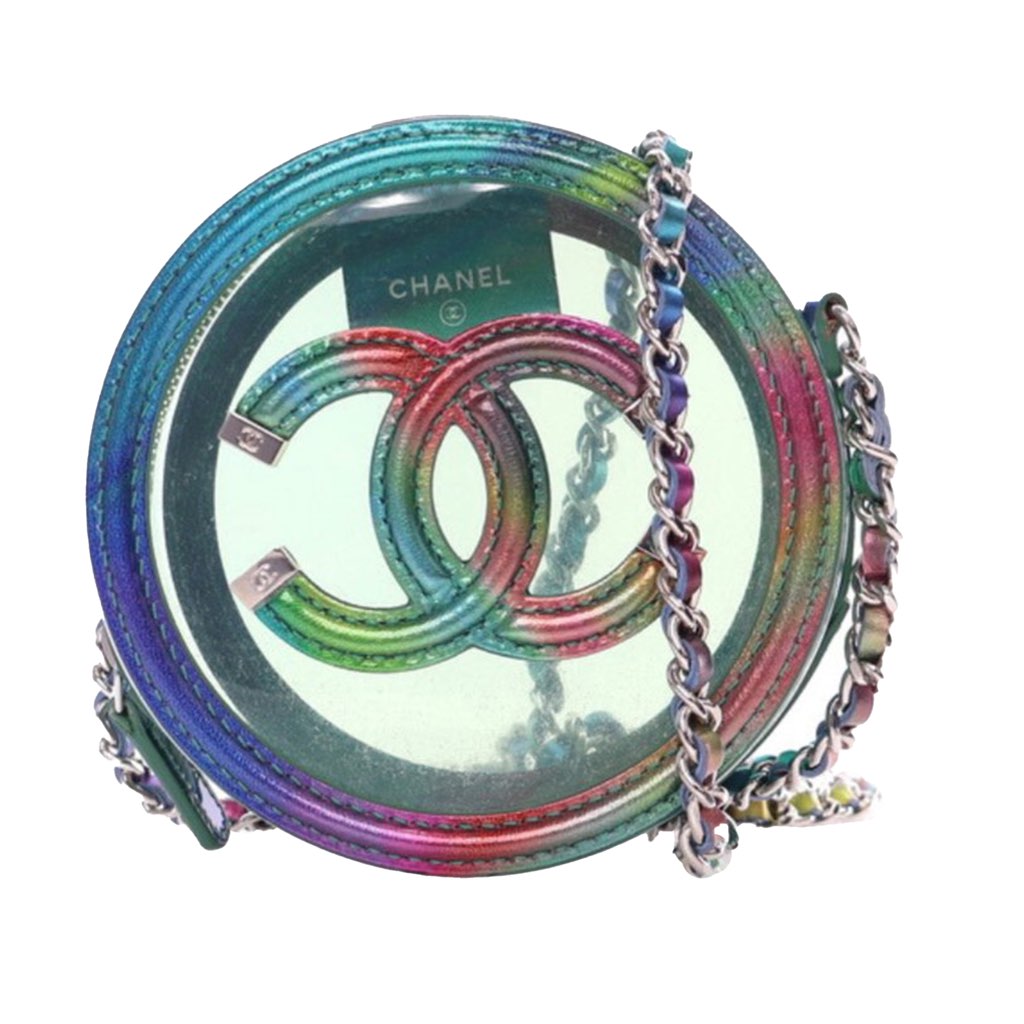 This crossbody bag features a PVC and lambskin leather body, a leather woven chain strap, and a top zip closure.