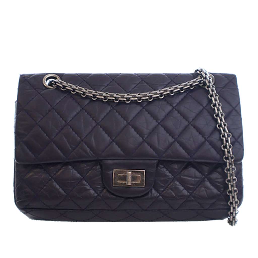 This shoulder bag features a quilted calfskin body, silver- tone chain link shoulder straps, double front flaps with twist-lock closure, an exterior back slip pocket, and interior zip and slip pockets.