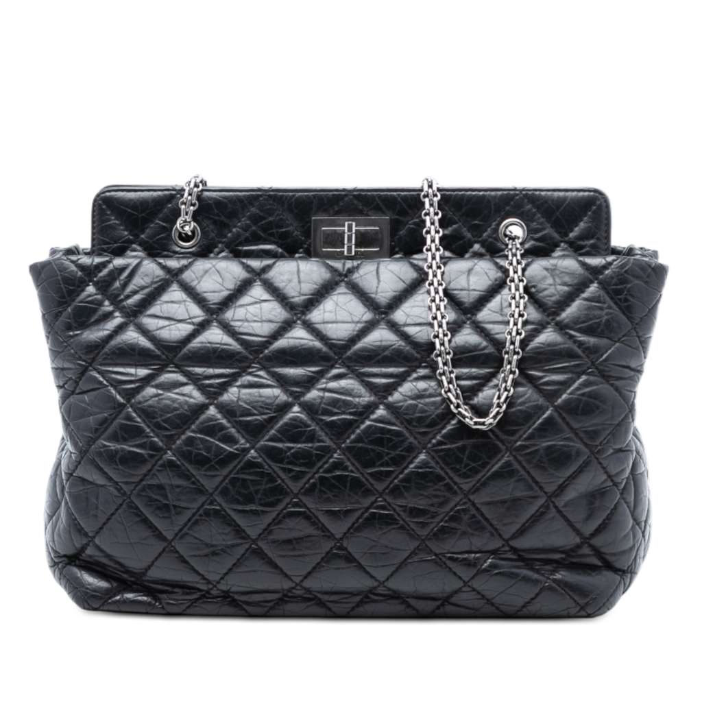 This tote features a quilted aged calf leather body, chain link straps, an open top with twist lock closure, an interior zip compartment, and interior zip and slip pockets.