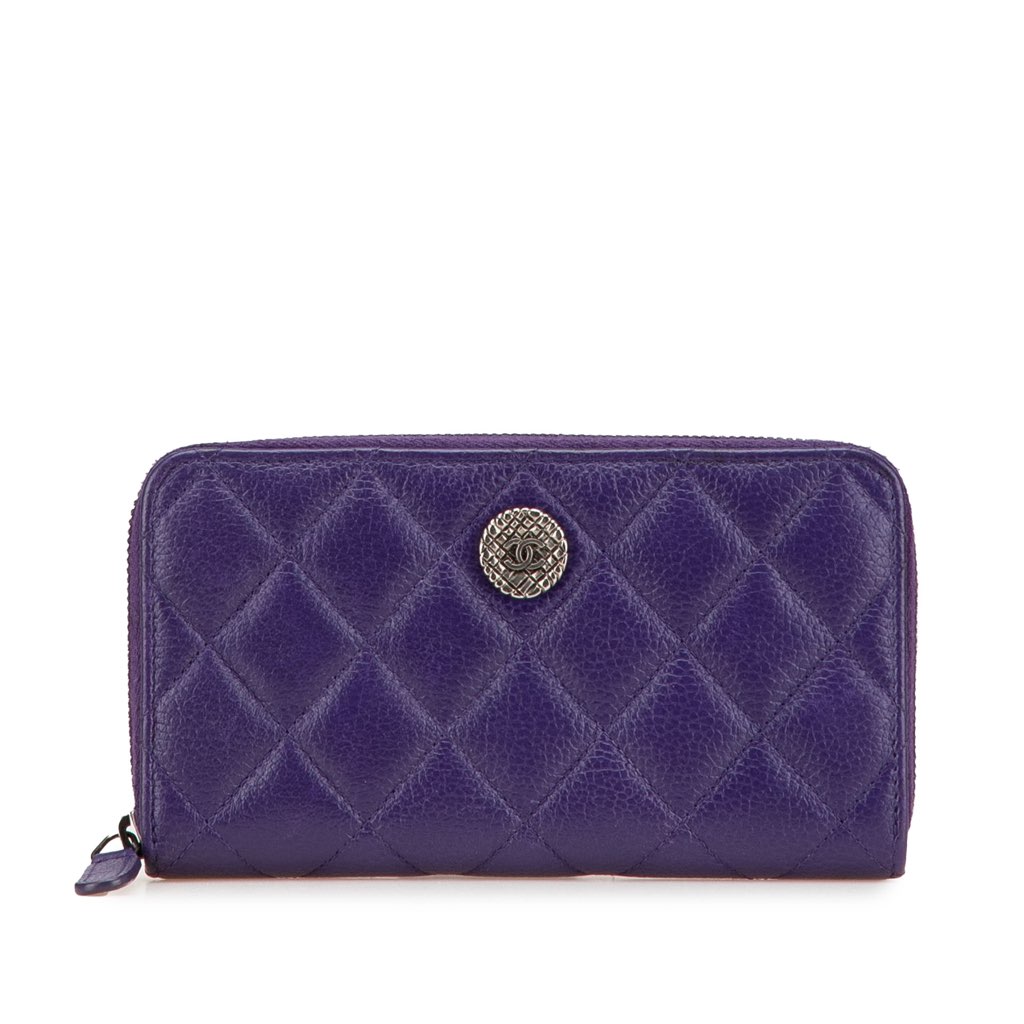 This wallet features a quilted leather body, a zip around closure, and interior zip and slip pockets.