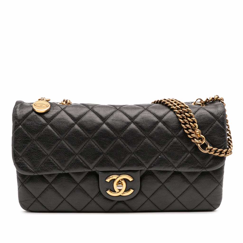 This shoulder bag features a quilted lambskin leather body, chain link straps, a front flap with CC turn-lock closure, an exterior back zip compartment, and an interior zip pocket.