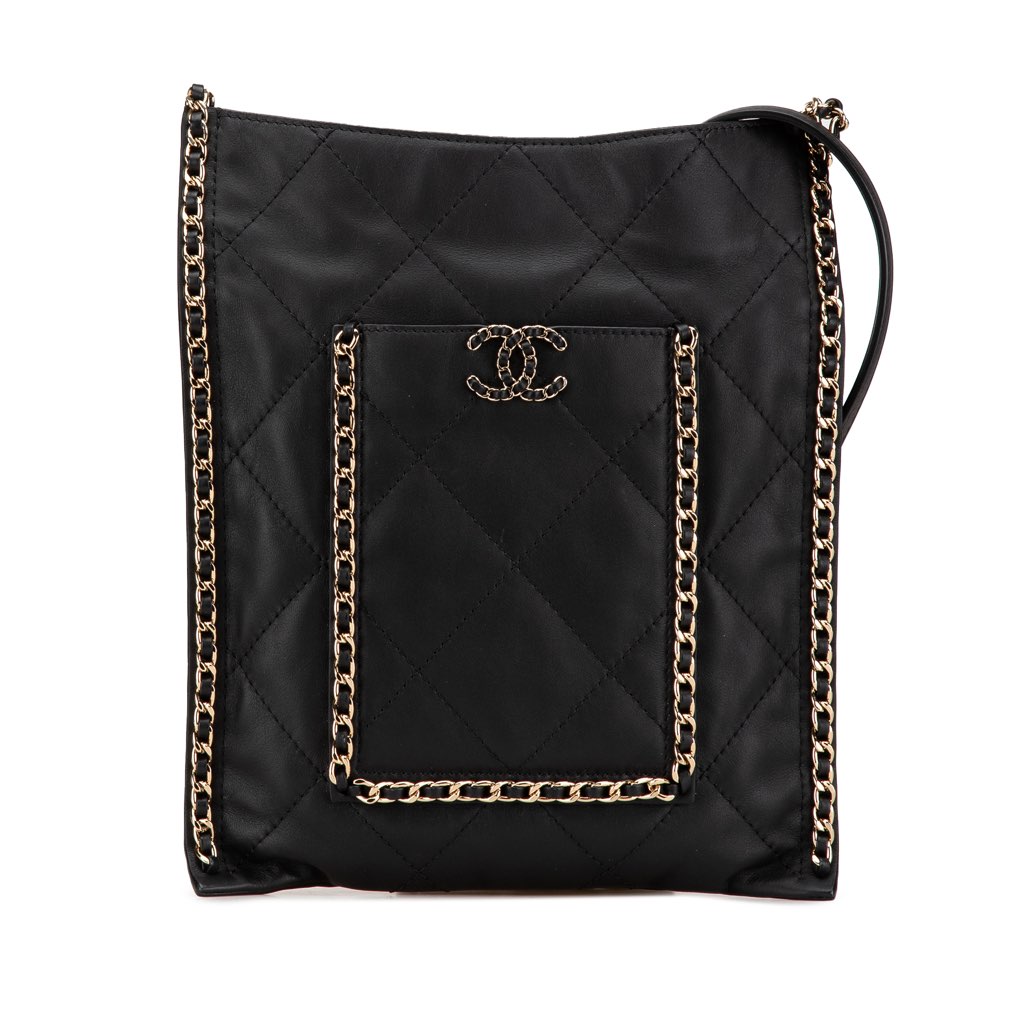 This tote features a quilted leather body, leather-woven chain straps with leather guard, and an open top.