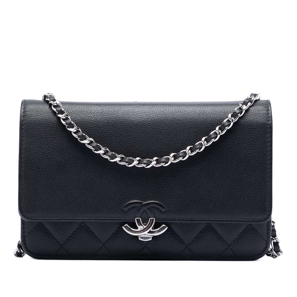 This Urban Companion wallet on chain features a calf leather body, a leather woven chain strap with leather guard, a front flap with a pusk lock closure, interior zip and open compartments, an interior zip pocket, and interior card slots.