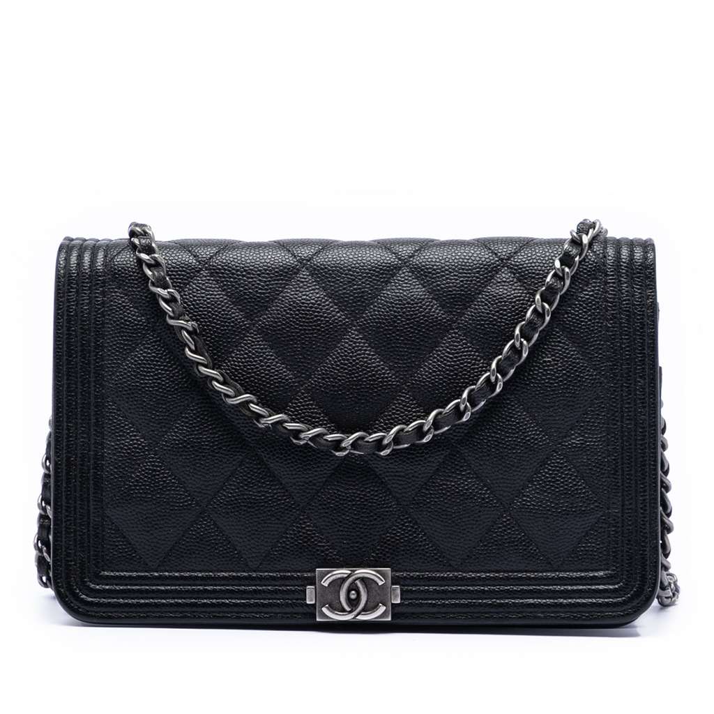 The Boy wallet on chain features a quilted caviar leather body, a leather woven chain strap, a front flap with push lock closure, and interior zip and slip pockets.