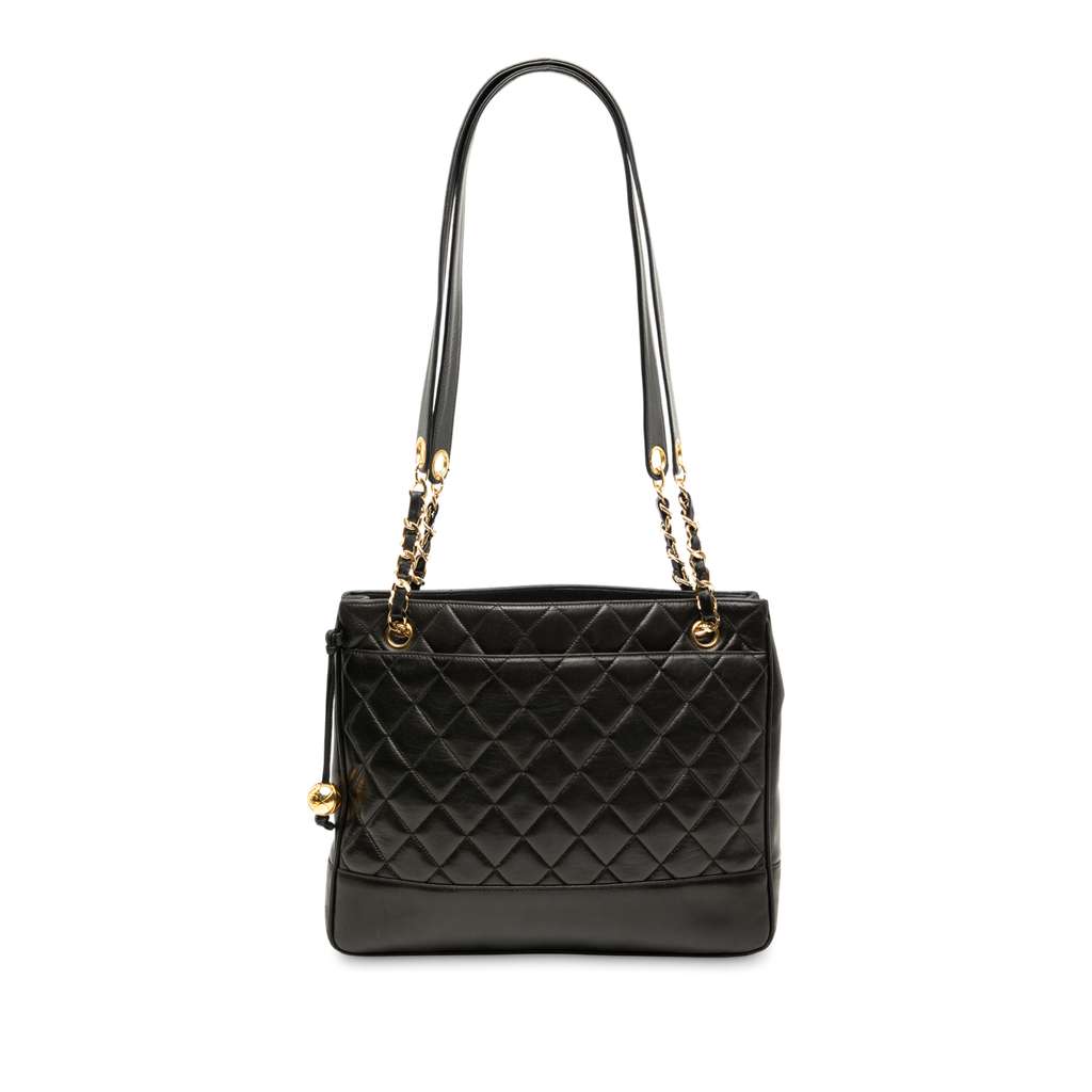 This tote bag features a quilted caviar leather body, leather woven chain and flat leather straps, an open with snap closure, exterior front and back slip pockets, and interior zip pockets.