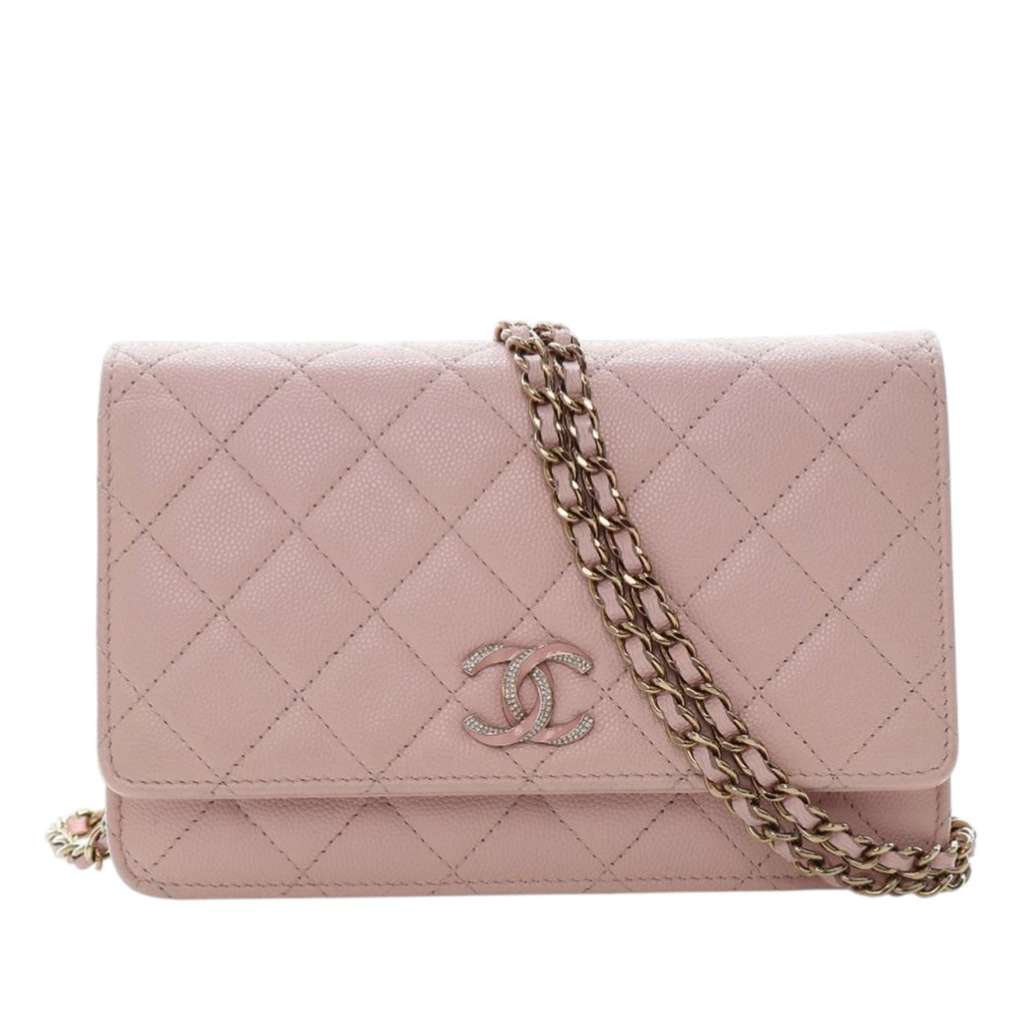 This wallet on chain features a quilted caviar leather body, a leather woven chain-link strap, a front flap with magnetic snap closure, an exterior back slip pocket, and interior zip and slip pockets.