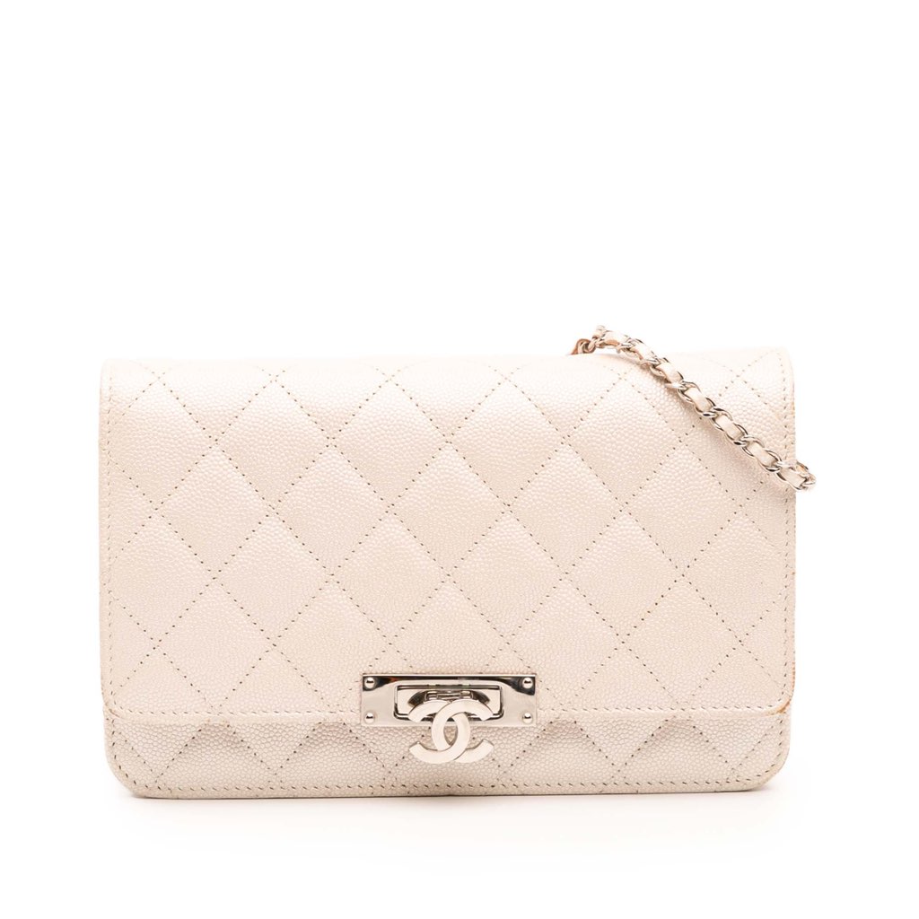 This wallet on chain features a quilted caviar leather body, a leather woven chain link shoulder strap, a flap with a CC flip-lock closure, and interior slip and zip pockets.