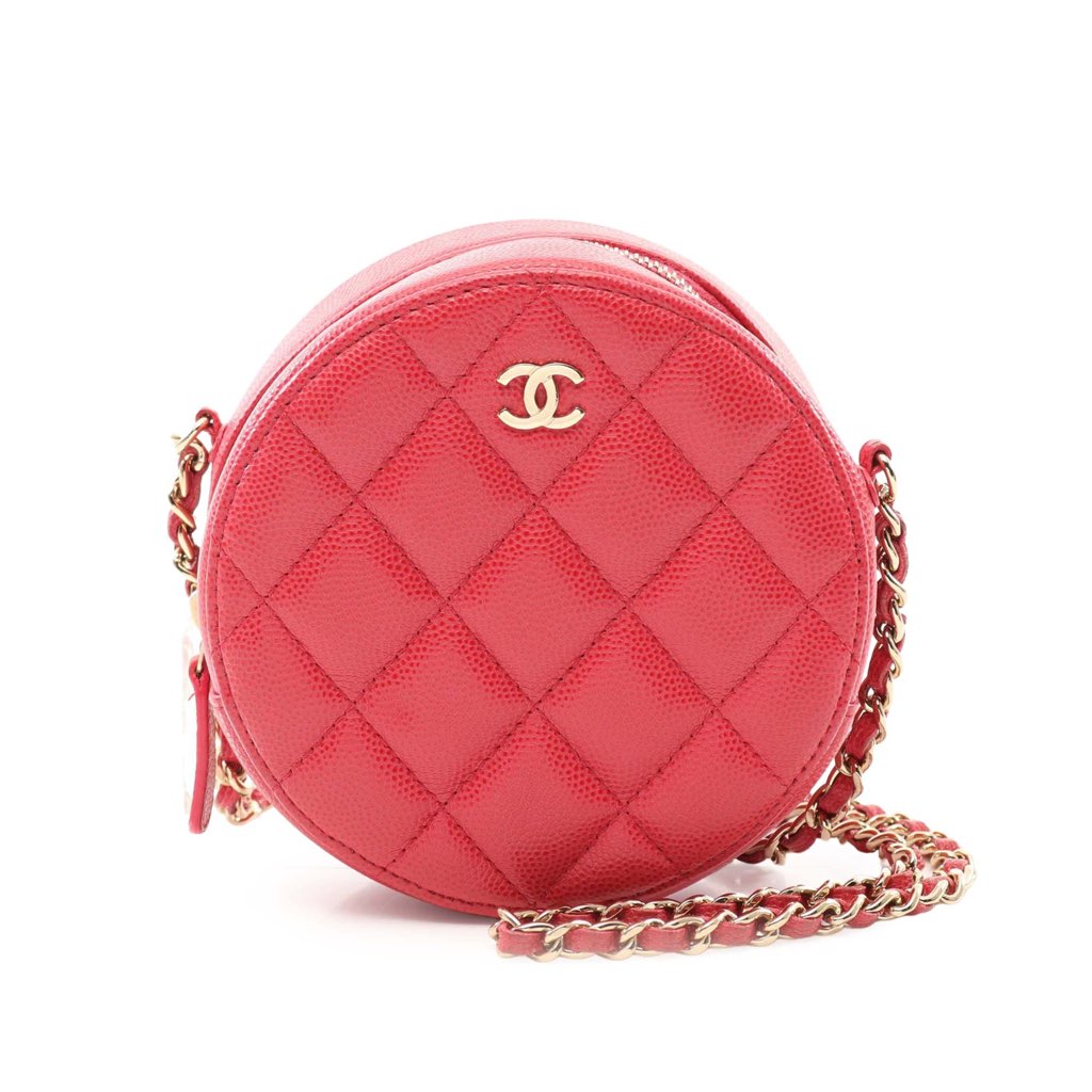 This crossbody bag features a quilted caviar leather body, a leather woven chain link strap, a top zip closure, and interior slip pockets.