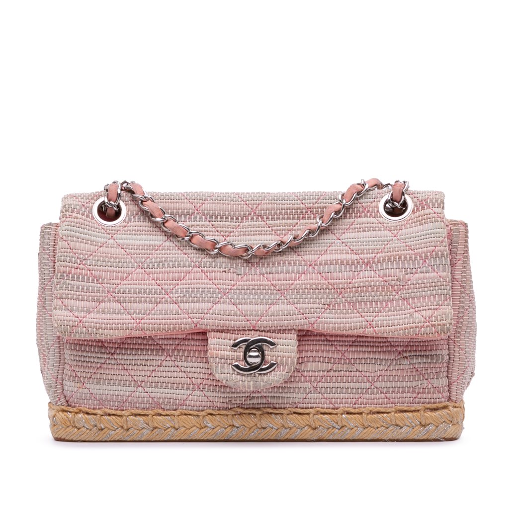 This shoulder bag features a tweed body, a leather-woven chain link strap, a front flap with CC and twist-lock closure, an exterior back slip pocket, and interior zip and slip pockets.