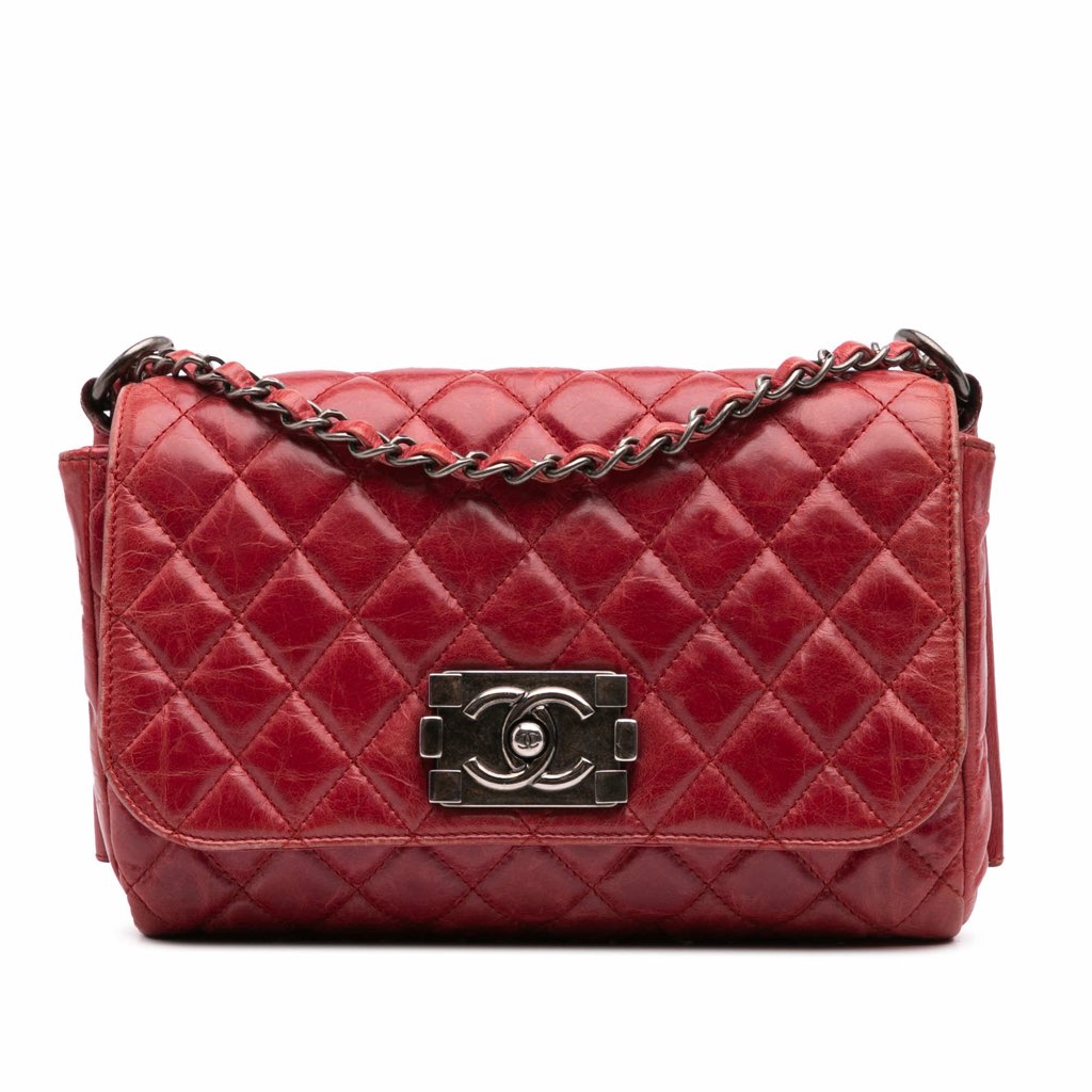 This shoulder bag features a quilted calfskin leather body, leather woven chain strap link straps, a front flap with a CC push lock closure, and an interior zip pocket.