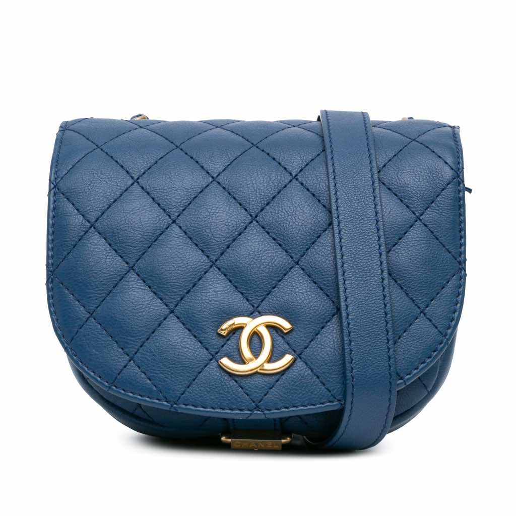 This crossbody bag features a quilted calf leather body, a leather woven chain link and flat leather shoulder strap, a front flap with magnetic snap button and buckle closure, and an interior zip pocket.