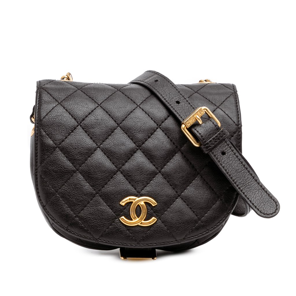 This crossbody features a quilted leather body, curb chain strap, a front flap with magnetic closure, and interior zip and slip pockets.