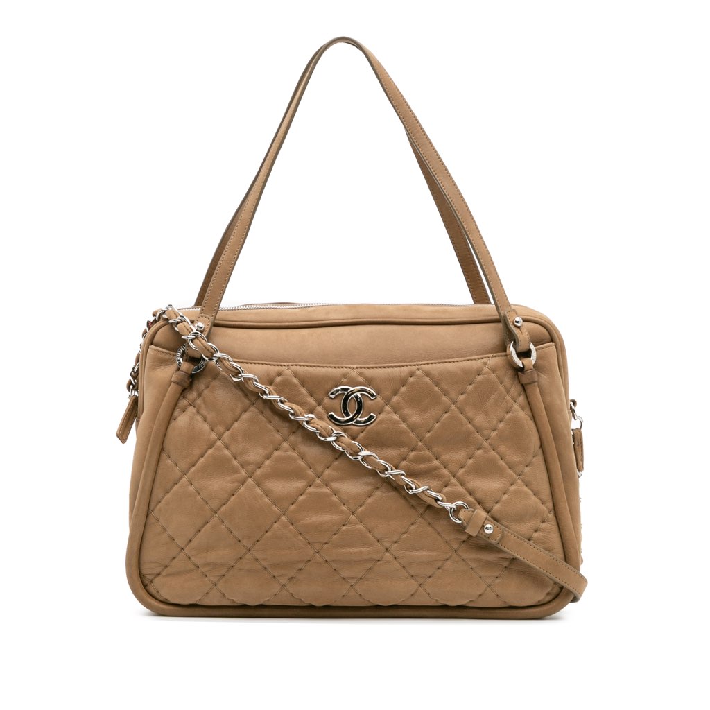 This satchel features a quilted calfskin body, flat leather handles, a leather woven chain strap with leather guard, a top zip closure, exterior slip pockets, and interior zip and slip pockets.